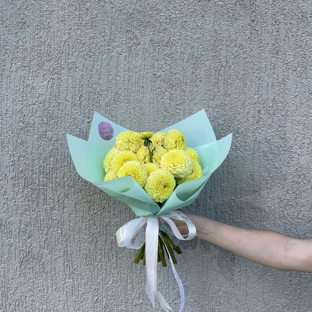 георгины – 17 шт. Упаковка – 1 шт. Атласная лента – 1 шт.