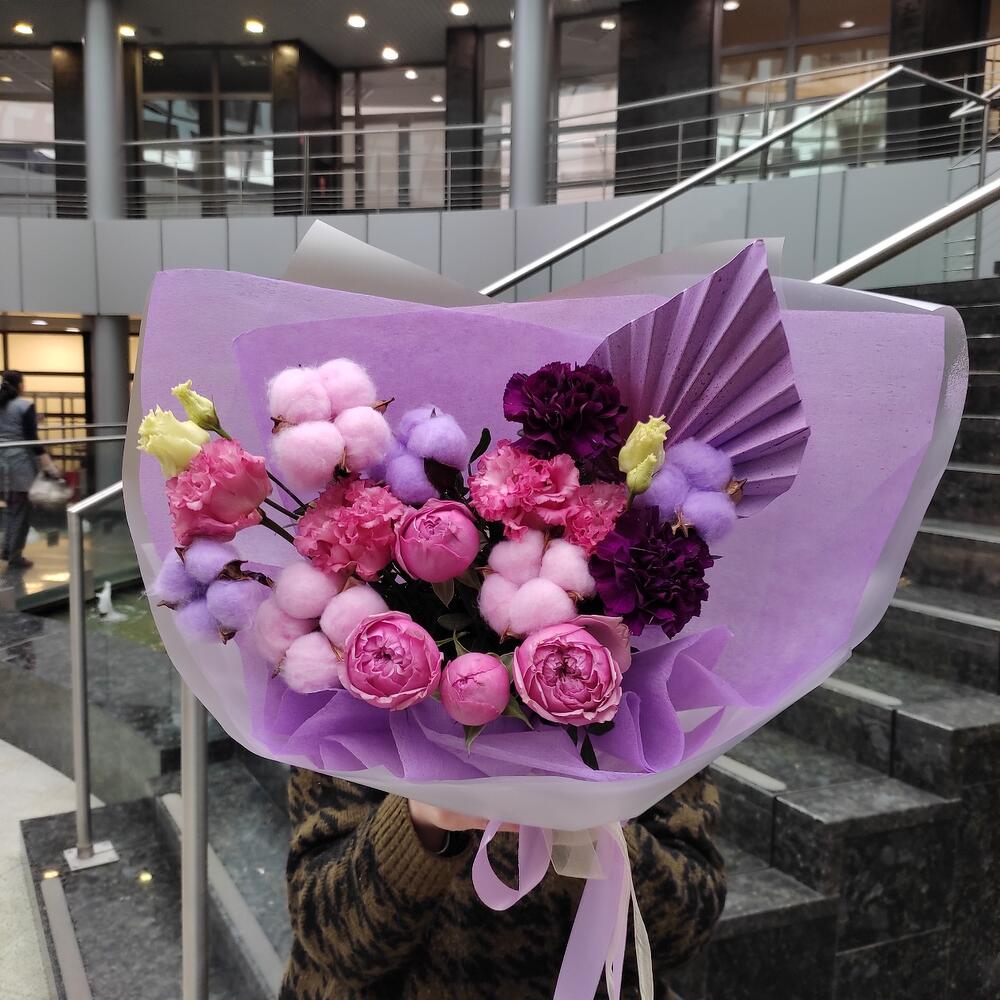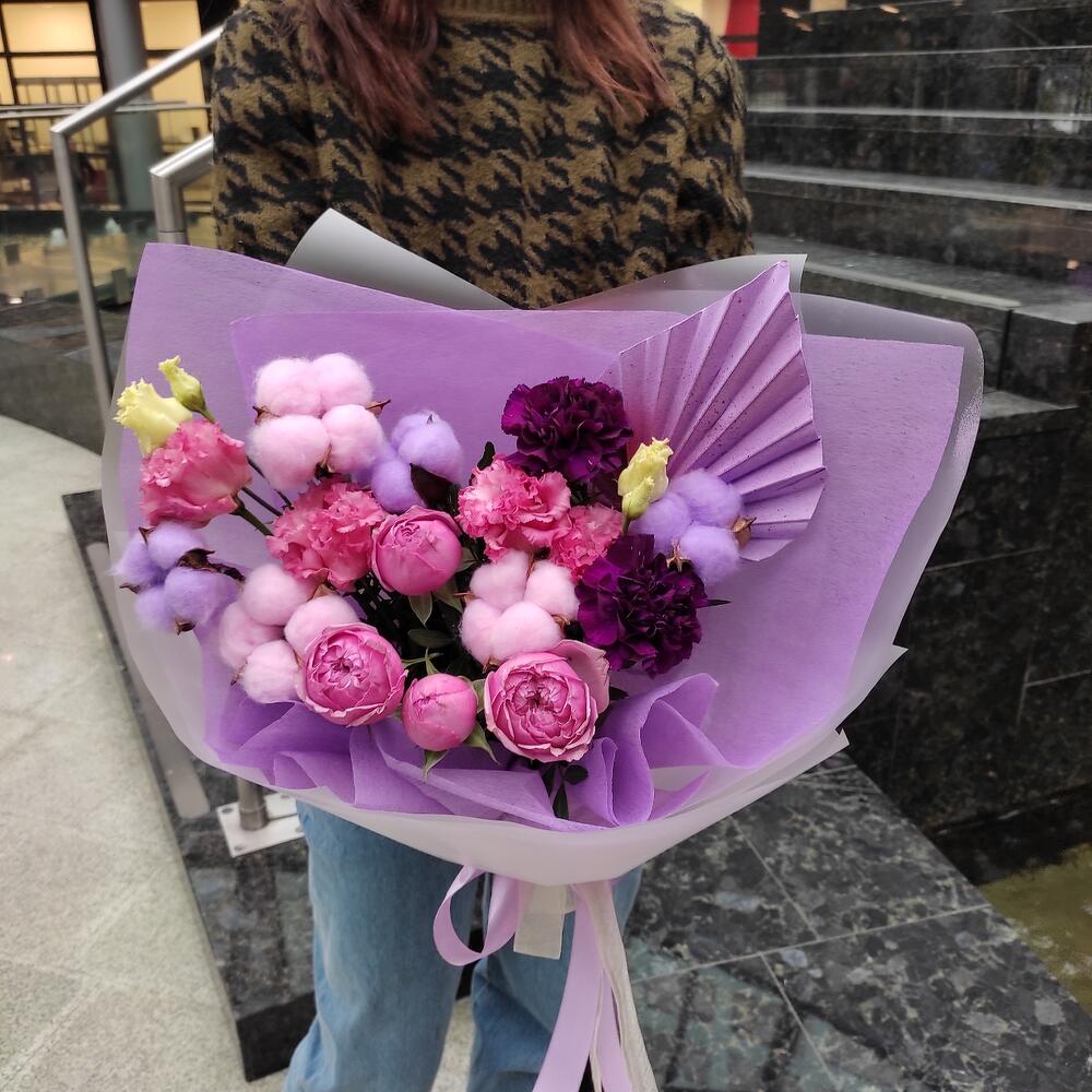 Лизиантус – 1 шт.Хлопок – 6 шт.Диантус – 2 шт.Роза кустовая пионовидная – 1 шт.Пальма – 1 шт.Лента – 2 шт.Упаковка дизайнерская – 2 шт.