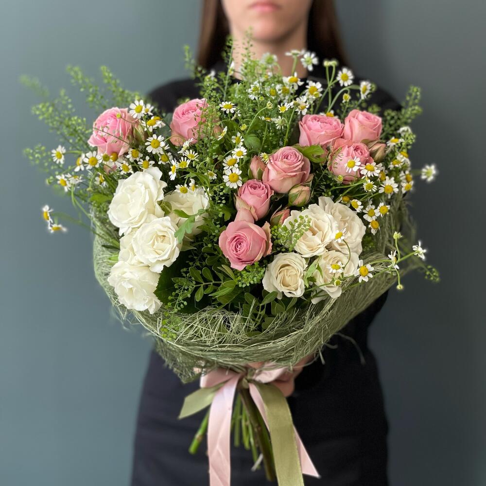 Лента – 1 шт.Роза кустовая – 5 шт.Матрикария – 4 шт.Мешковина – 1 шт.зелень декоративная – 2 шт.
