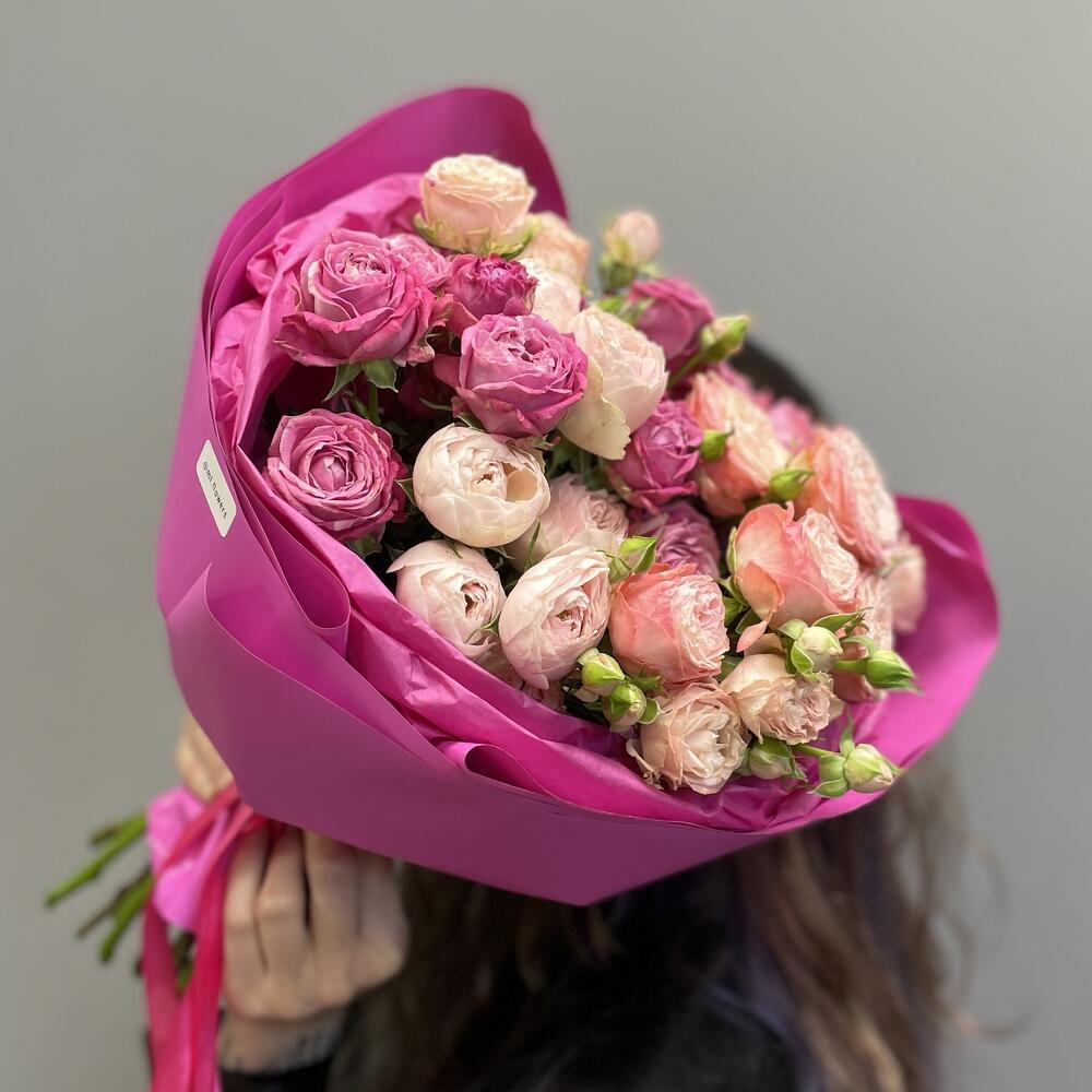 Фисташка – 2 шт.Авторская упаковка – 1 шт.пионовидная кустовая роза микс – 7 шт.