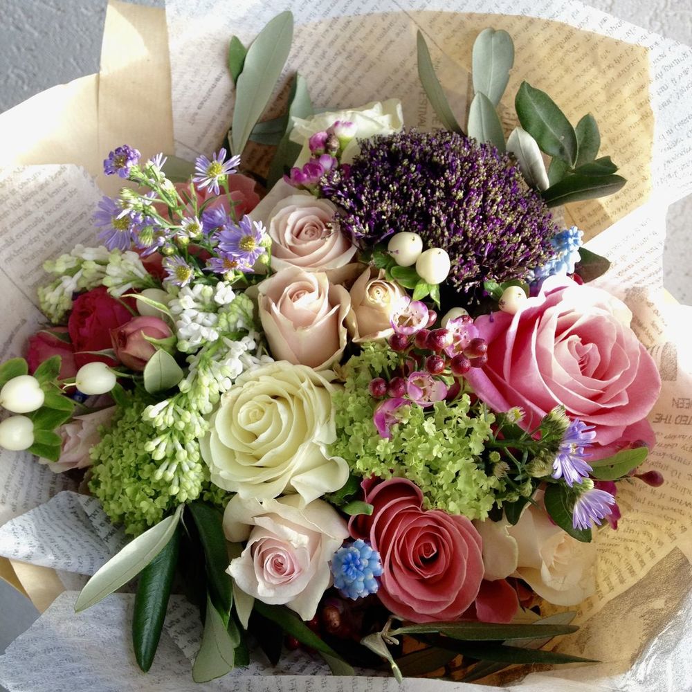 Роза одноголовая розовая – 3 шт.Роза белая – 3 шт.Роза пионовидная – 1 шт.Ваксфлауэр – 3 шт.Эвкалипт – 1 шт.Вибурнум – 1 шт.Трахелиум пурпур Лайк Мичиган – 1 шт.Маттиола белая – 1 шт.