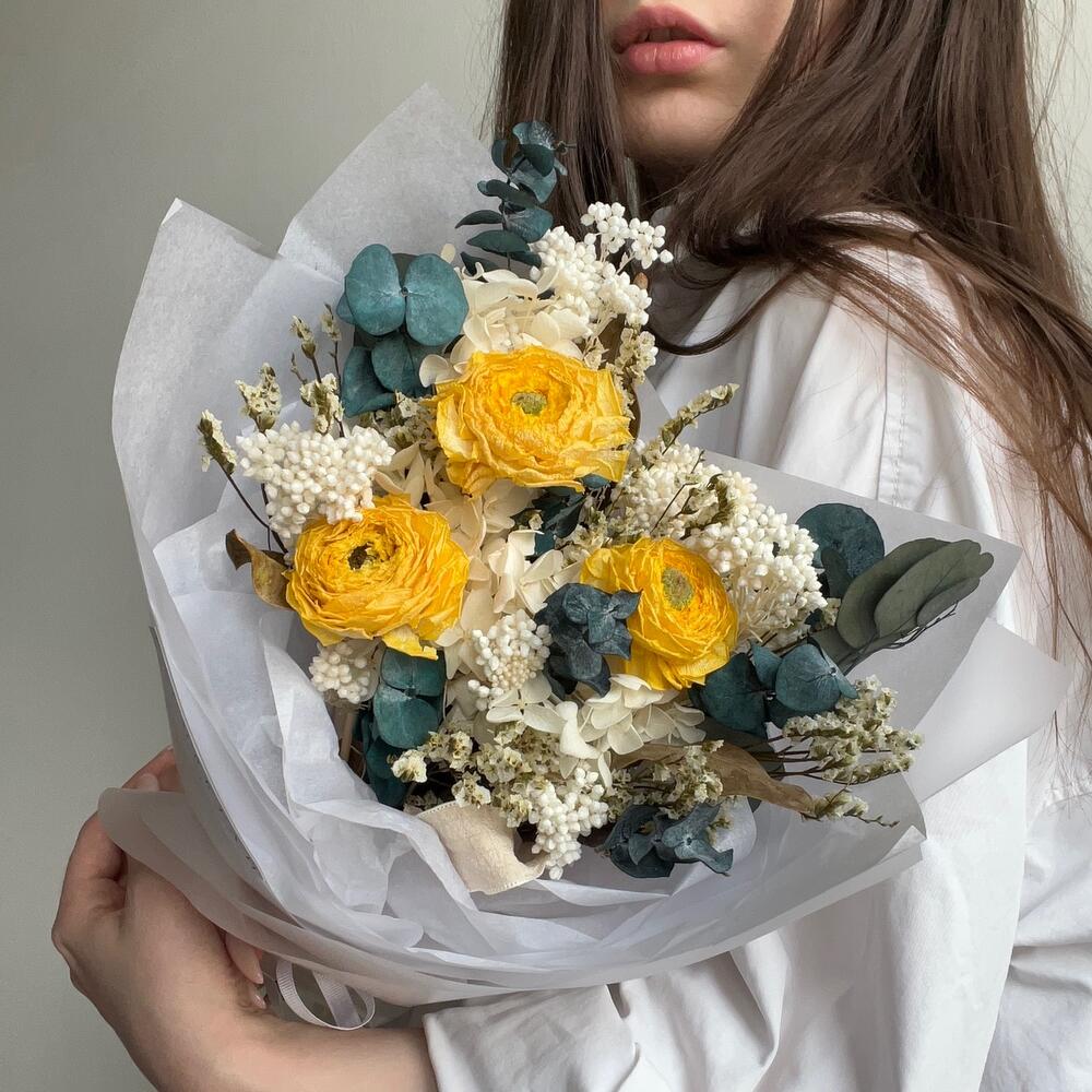 Лимониум – 2 шт.Озотамнус – 2 шт.Эвкалипт – 4 шт.Упаковка дизайнерская – 1 шт.листья протеи – 3 шт.ранункулюс сухоцвет – 3 шт.
